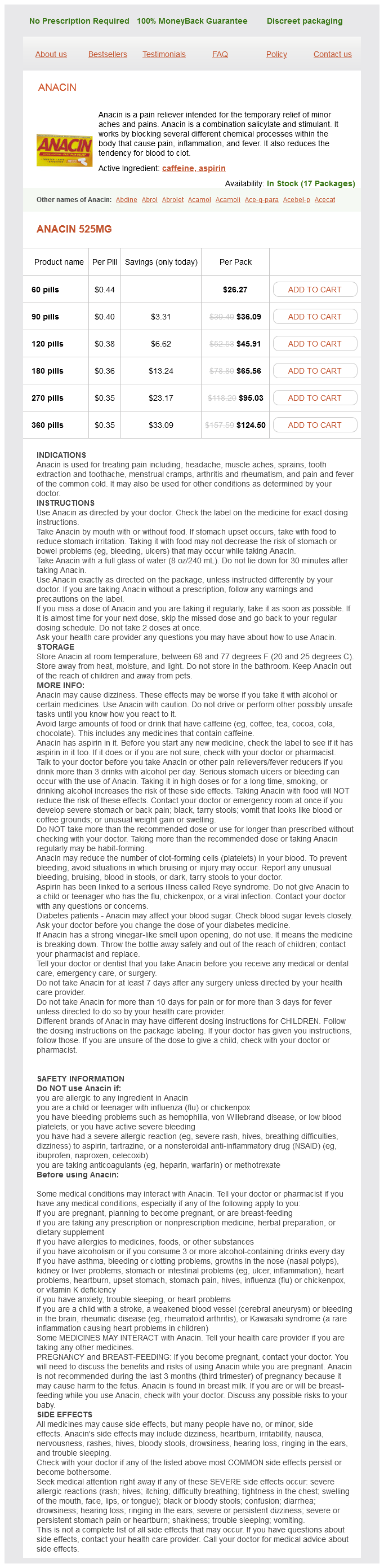Anacin packs: 60 pills, 90 pills, 120 pills, 180 pills, 270 pills, 360 pills