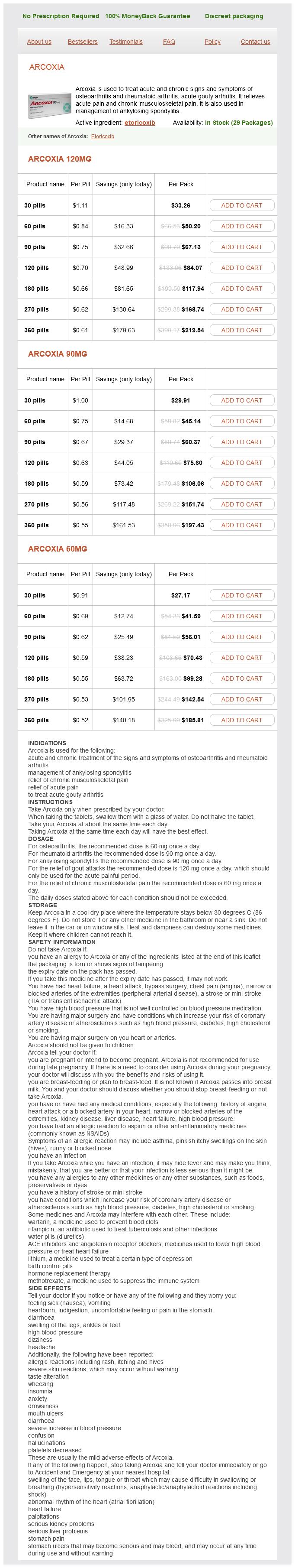 Arcoxia packs: 30 pills, 60 pills, 90 pills, 120 pills, 180 pills, 270 pills, 360 pills