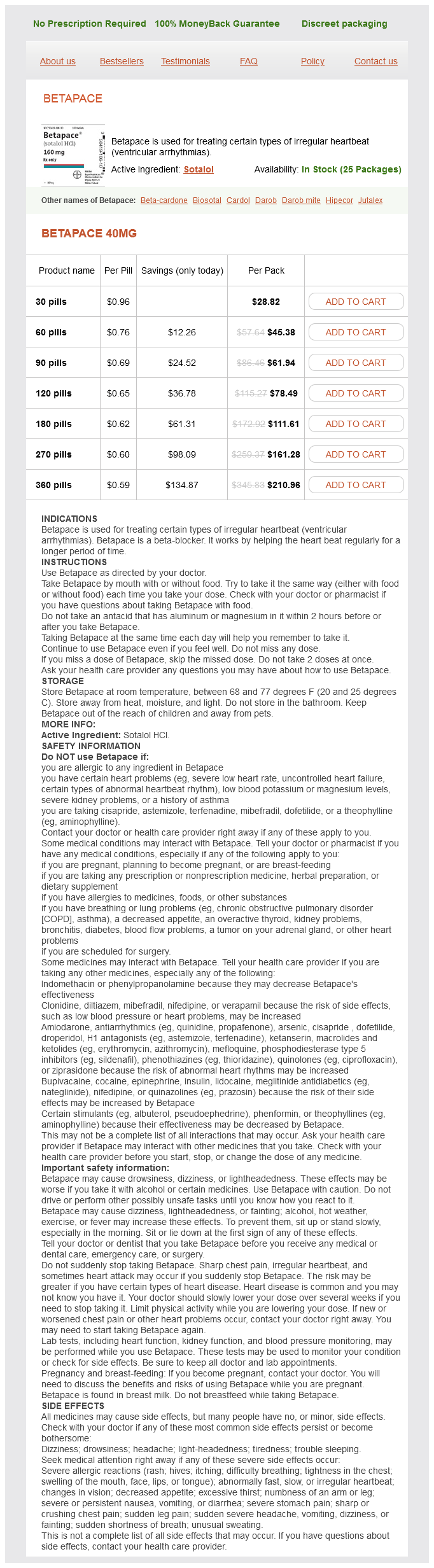 Betapace packs: 30 pills, 60 pills, 90 pills, 120 pills, 180 pills, 270 pills, 360 pills