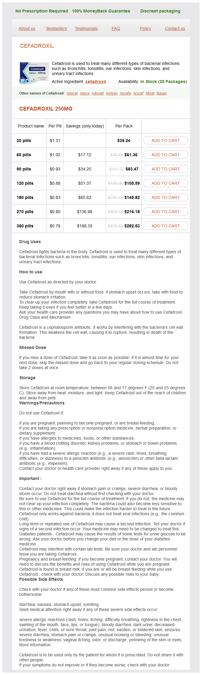 Cefadroxil packs: 30 pills, 60 pills, 90 pills, 120 pills, 180 pills, 270 pills, 360 pills