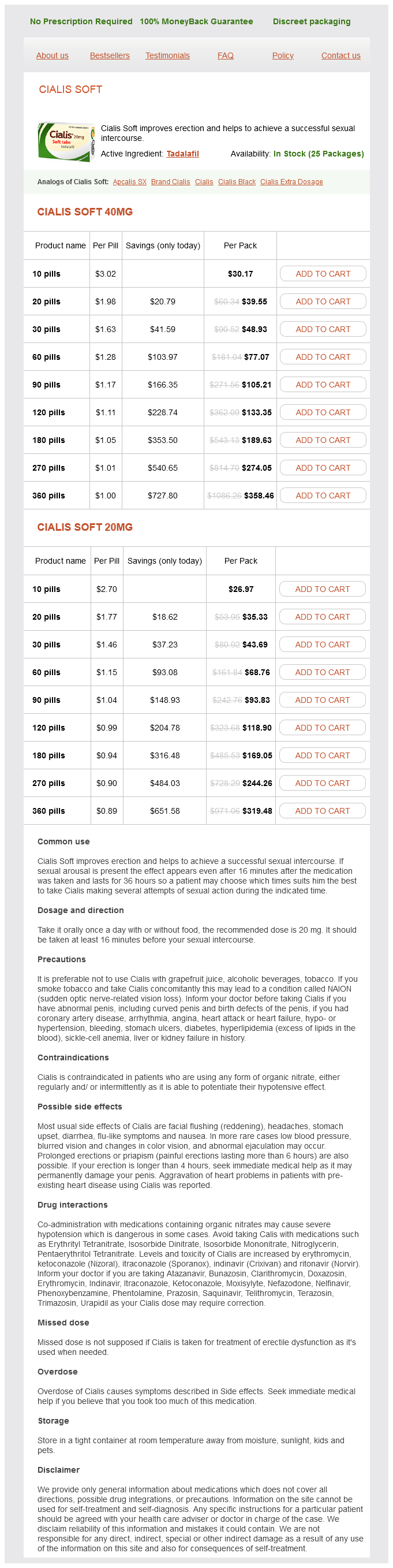 Cialis Soft packs: 10 pills, 20 pills, 30 pills, 60 pills, 90 pills, 120 pills, 180 pills, 270 pills, 360 pills