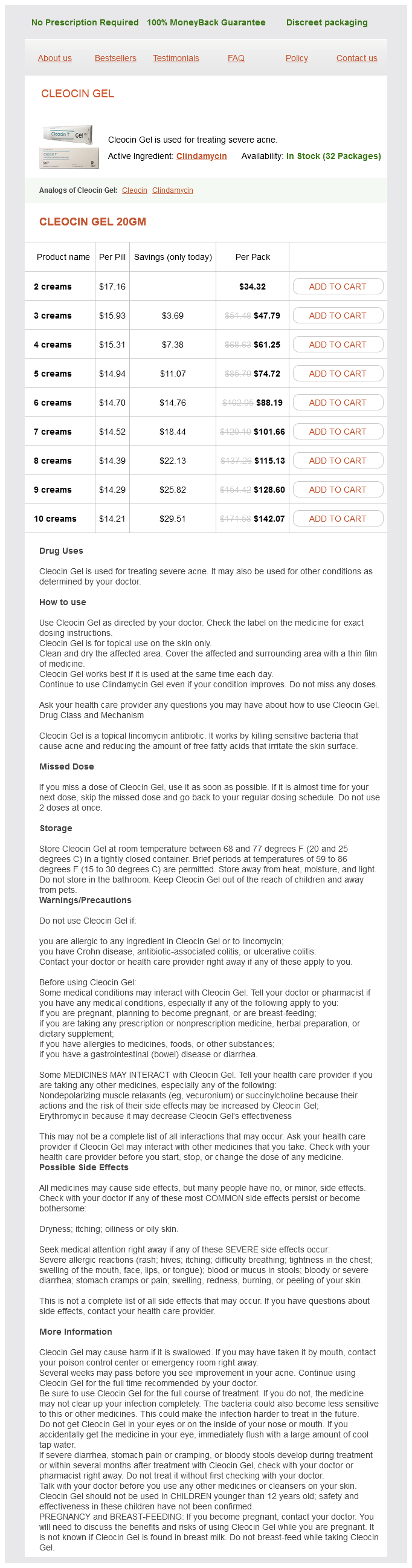 Cleocin Gel packs: 2 creams, 3 creams, 4 creams, 5 creams, 6 creams, 7 creams, 8 creams, 9 creams, 10 creams