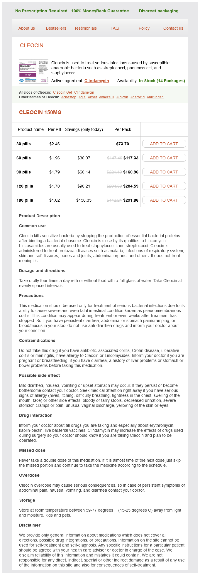 Cleocin packs: 30 pills, 60 pills, 90 pills, 120 pills, 180 pills