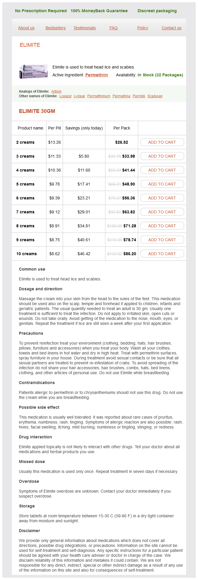 Although few data are available on the appropriate progestogen dose acne keloid treatment elimite 30 gm buy fast delivery, some data indicate that 10 days every 12 weeks may be sufficient to prevent endometrial hyperplasia. However, there was an increased risk of stroke with estrogen-alone compared with placebo (approximately 12 more strokes for every 10,000 women treated per year with estrogen therapy). Therefore, these trials were unable to assess the true risk in younger, potentially healthier women with fewer cardiovascular risk factors. There were also more deaths from breast cancer and deaths overall with combination therapy than with placebo. Whether or not the risk differs between continuous and sequential use of progestogens is questionable. Some evidence suggests that sequential use may be safer than taking progestogen each day. Breast cancer risk increased in current users in both the estrogen and progestogen arm and the estrogen only arm of the study, and the risks increased with longer duration of use. She reports adherence with her medications, a healthy diet and exercise routine, and her medical conditions are controlled. However, 1 month ago she was diagnosed with stage 2 breast cancer following a routine mammogram. Again, if symptoms recur, continue on the current dose until symptoms resolve or stabilize before trying a subsequent decrease. These tapering regimens have not been studied in clinical trials and may not prove to be beneficial in individual women. Therapy should be tapered before discontinuation in order to limit the recurrence of hot flashes. The dose taper involves decreasing the dose of estrogen over several weeks to months and monitoring closely for symptom return. A wide range of therapies, both prescription and herbal, have been studied with limited success. A variety of nonhormonal and alternative therapies (Table 503) have been studied for symptomatic management of vasomotor symptoms. It should be noted that randomized, placebo-controlled trials of these alternative therapies have not established safety and efficacy for prevention or treatment of menopausal symptoms. These antidepressant medications offer a reasonable option for women who are unwilling to or cannot take hormonal therapies, particularly those who suffer from depression or anxiety. Phytoestrogens are plant sterols that are structurally similar to human and animal estrogen.