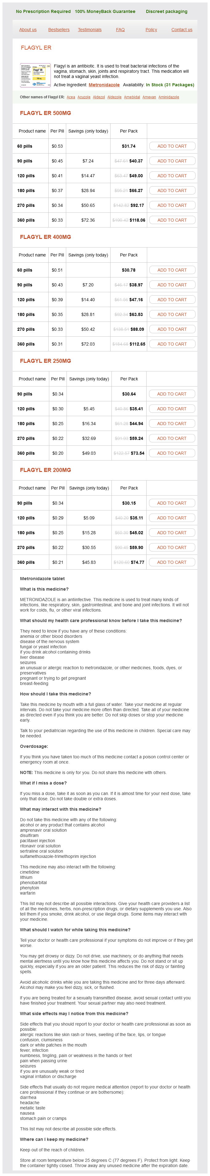 Flagyl packs: 60 pills, 90 pills, 120 pills, 180 pills, 270 pills, 360 pills