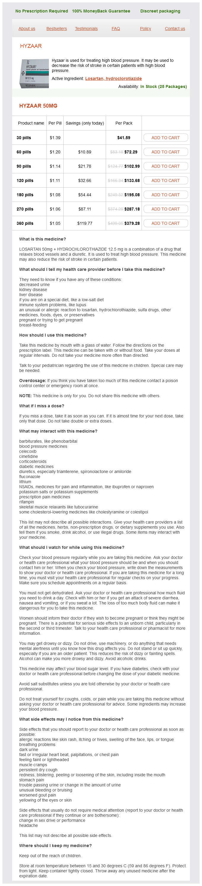 Hyzaar packs: 30 pills, 60 pills, 90 pills, 120 pills, 180 pills, 270 pills, 360 pills