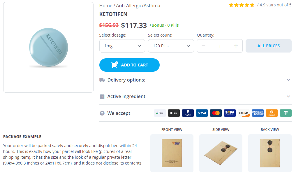 Ketotifen packs: 30 pills, 60 pills, 120 pills, 240 pills, 300 pills