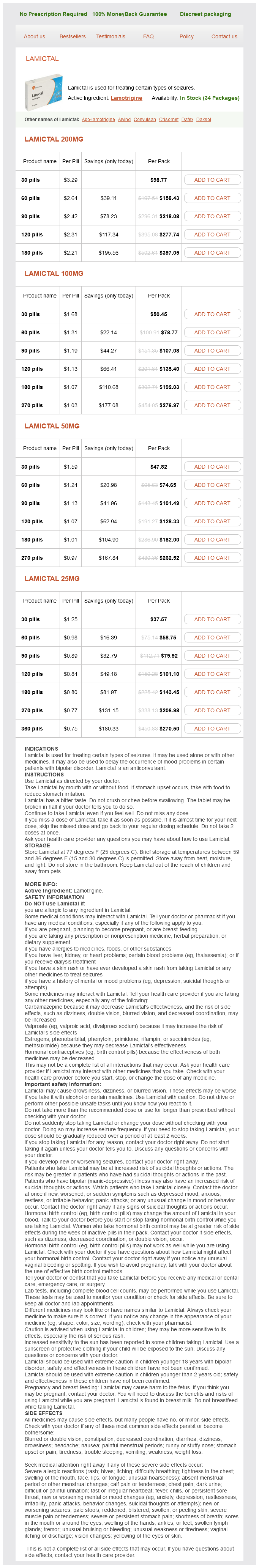 Lamictal packs: 30 pills, 60 pills, 90 pills, 120 pills, 180 pills, 270 pills, 360 pills