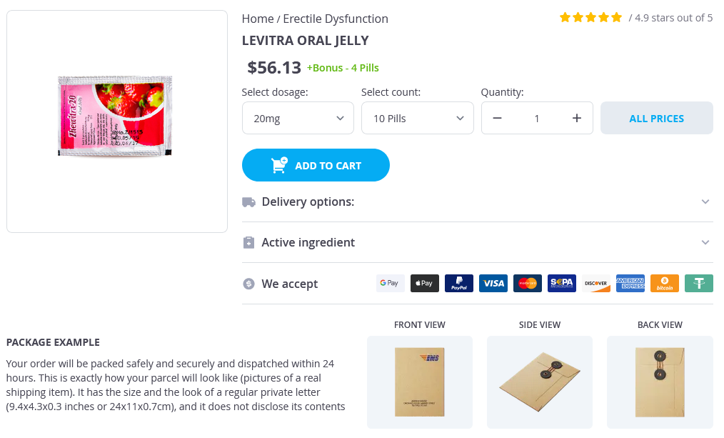 - Levitra Oral Jelly 20mg × 10 Pills - $56.13