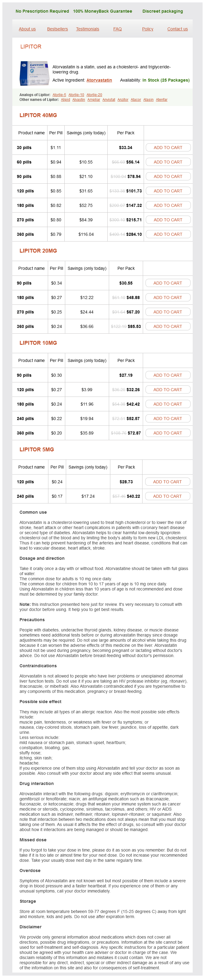 Lipitor packs: 30 pills, 60 pills, 90 pills, 120 pills, 180 pills, 270 pills, 360 pills, 240 pills