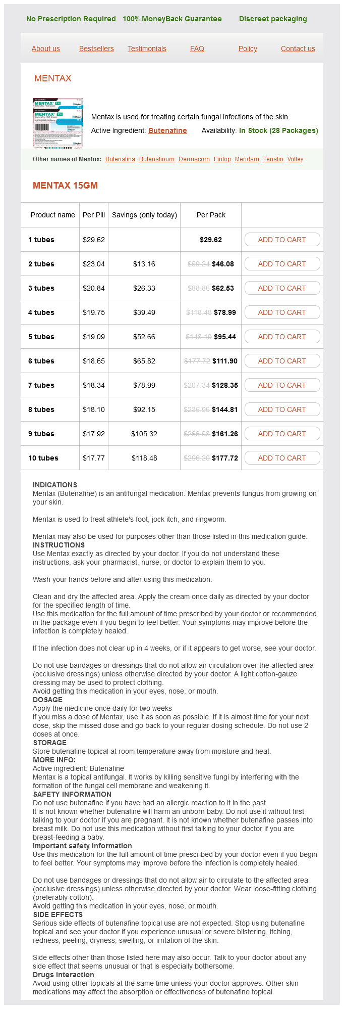 Lack of effect of efavirenz on the pharmacokinetics of tipranavir/ritonavir in healthy volunteers antifungal gel prescription generic 15 mg mentax. Interactions between natural health products and antiretroviral drugs: pharmacokinetic and pharmacodynamic effects. Paralytic ileus possibly associated with interaction between ritonavir/lopinavir and vincristine. A case of iatrogenic adrenal suppression after co-administration of cobicistat and fluticasone nasal drops. Coadministration of lopinavir/ritonavir and phenytoin results in two-way drug interaction through cytochrome P-450 induction. Steady state pharmacokinetic and safety profiles of voriconazole and ritonavir in healthy male subjects. Steady-state pharmacokinetics of fosamprenavir and raltegravir alone and combined with unboosted and ritonavir-boosted fosamprenavir. Pharmacokinetic characterisation of different dose combinations of coadministered tipranavir and ritonavir in healthy volunteers. Effect of ritonavir-boosted tipranavir or darunavir on the steady-state pharmacokinetics of elvitegravir. Co-administration of rivaroxaban with drugs that share its elimination pathways: pharmacokinetic effects in healthy subjects. Oxycodone concentrations are greatly increased by the concomitant use of ritonavir or lopinavir/ ritonavir. Once daily maraviroc 300mg or 150mg in combination with ritonavir-boosted darunavir 800mg/100mg. Paper presented at the 8th Conference on Retroviruses and Opportunistic Infections, Chicago. Lopinavir and atazanavir in pregnancy: comparable infant outcomes, virological efficacies and preterm delivery rates. Clinically significant adverse events from a drug interaction between quetiapine and atazanavir-ritonavir in two patients. Paper presented at the 9th Conference on Retroviruses and Opportunistic Infections, Seattle. Pharmacokinetics of elvitegravir and etravirine following coadministration of ritonavir-boosted elvitegravir and etravirine. Safety/tolerability, pharmacokinetics and boosting of twice-daily cobicistat administered alone or in combination with darunavir or tipranavir. Pharmacokinetics and drug interaction profile of cobicistat boosted-elvitegravir with atazanavir, rosuvastatin or rifabutin. Symptomatic Bradycardia and Heart Failure Triggered by Ivabradine in a Patient Receiving Antiretroviral Therapy.