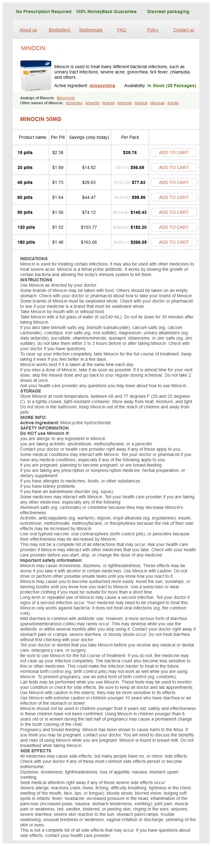 Minocin packs: 15 pills, 30 pills, 45 pills, 60 pills, 90 pills, 120 pills, 180 pills