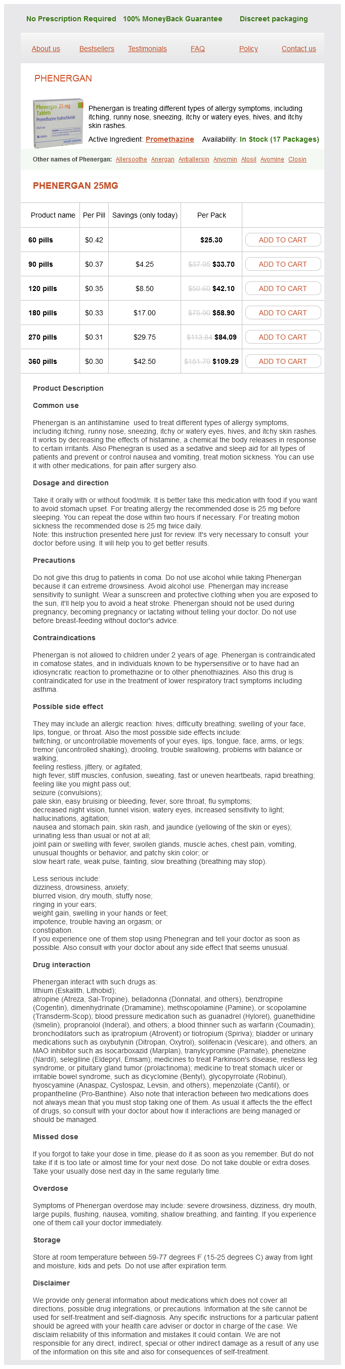 Phenergan packs: 60 pills, 90 pills, 120 pills, 180 pills, 270 pills, 360 pills