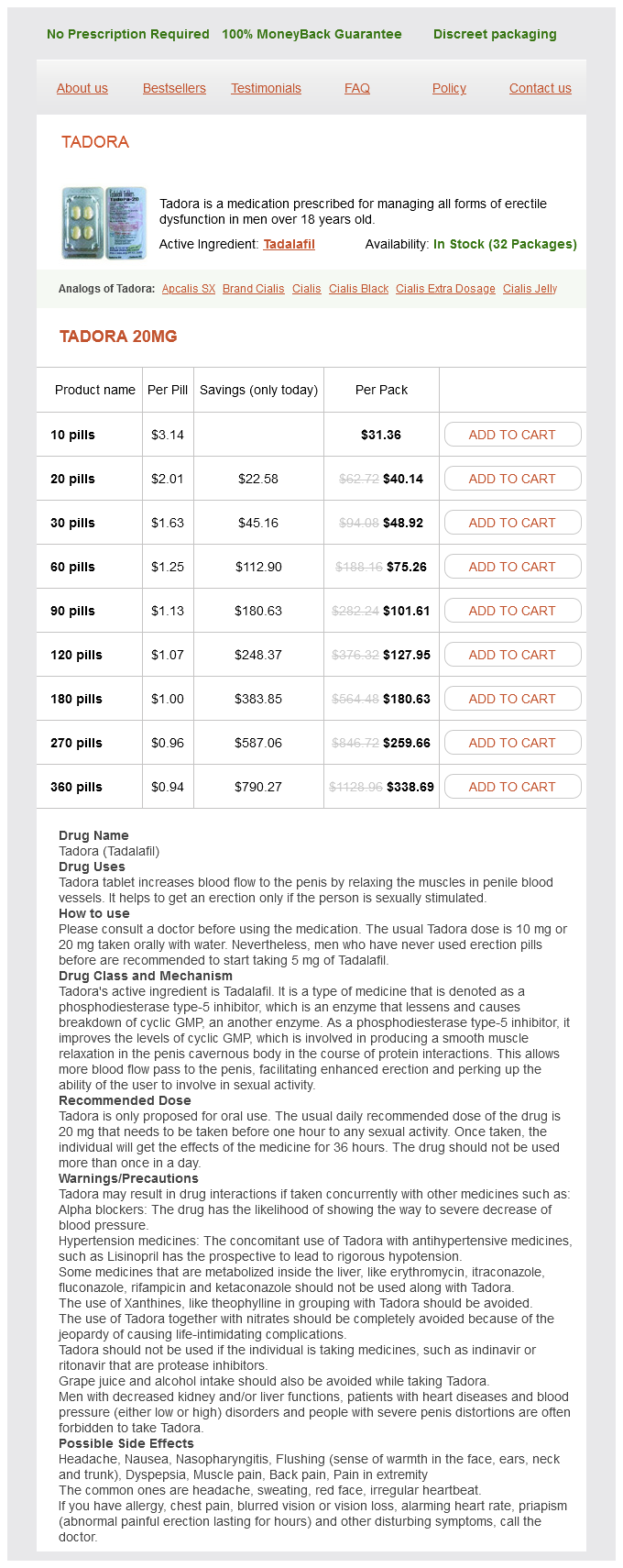 Tadora packs: 10 pills, 20 pills, 30 pills, 60 pills, 90 pills, 120 pills, 180 pills, 270 pills, 360 pills