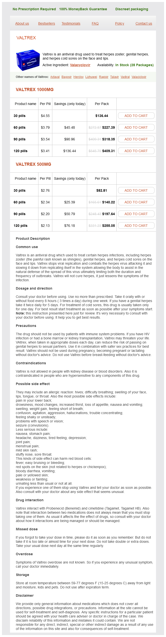 Valtrex packs: 30 pills, 60 pills, 90 pills, 120 pills