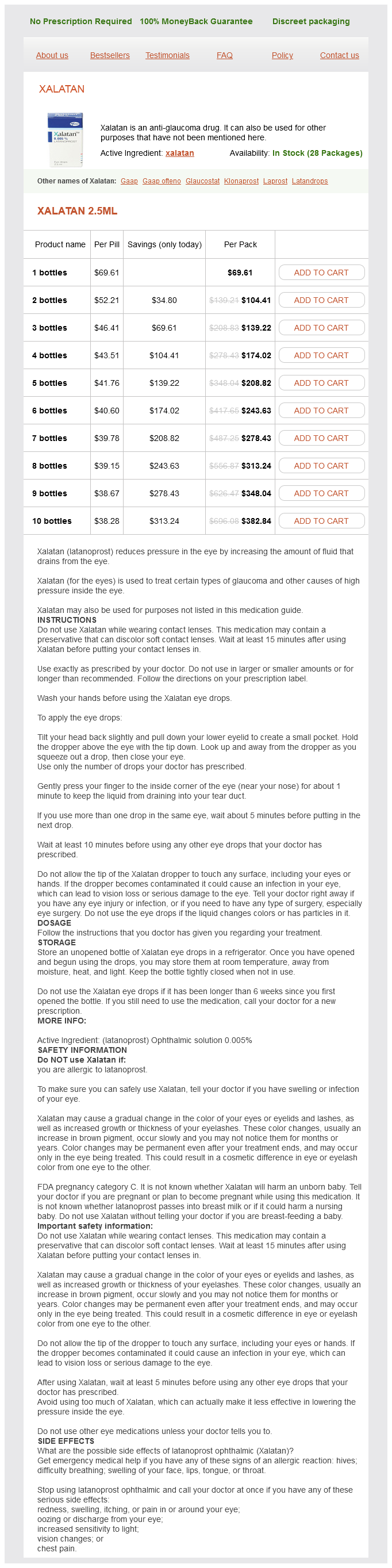 Low-dose methadone has an analgesic effect in neuropathic pain: a doubleblind randomized controlled crossover trial 714x treatment buy generic xalatan 2.5 ml online. Assessing the quality of reports of randomized clinical trials: is blinding necessary Switching from morphine to oral methadone in treating cancer pain: what is the equianalgesic dose ratio Fatal methadone toxicity: signs and circumstances, and the role of benzodiazepines. Controlled-release oxycodone for pain in diabetic neuropathy: a randomized controlled trial. Transdermal fentanyl for improvement of pain and functioning in osteoarthritis: a randomized, placebo-controlled trial. Long-term management of chronic pain with transdermal buprenorphine: a multicenter, open-label, follow-up study in patients from three short-term clinical trials. Human pharmacology and abuse potential of the analgesic buprenorphine: a potential agent for treating narcotic addiction. Acute pain management pharmacology for the patient with concurrent renal or hepatic disease. Effects of intermittent hemodialysis on buprenorphine and norbuprenorphine plasma concentrations in chronic pain patients treated with transdermal buprenorphine. Combination analgesia in 2005 a rational approach: focus on paracetamol-tramadol. Combination hydrocodone and ibuprofen versus combination codeine and acetaminophen for the treatment of chronic pain. Tramadol/acetaminophen combination tablets and codeine/acetaminophen combination capsules for the management of chronic pain: a comparative trial. Tramadol/ acetaminophen combination tablets for the treatment of chronic lower back pain: a multicenter, randomized, double-blind, placebo-controlled outpatient study. Analgesic efficacy and safety of tramadol/acetaminophen combination tablets (Ultracet) in treatment of chronic low back pain: a multicenter, outpatient, randomized, double blind, placebo controlled trial. Tramadol and acetaminophen combination tablets in the treatment of fibromyalgia pain: a double-blind, randomized, placebocontrolled study. Treatment of osteoarthritis pain with controlled release oxycodone or fixed combination oxycodone plus acetaminophen added to nonsteroidal antiinflammatory drugs: a double blind, randomized, multicenter, placebo controlled trial. Gabapentin and postoperative pain a systematic review of randomized controlled trials.
